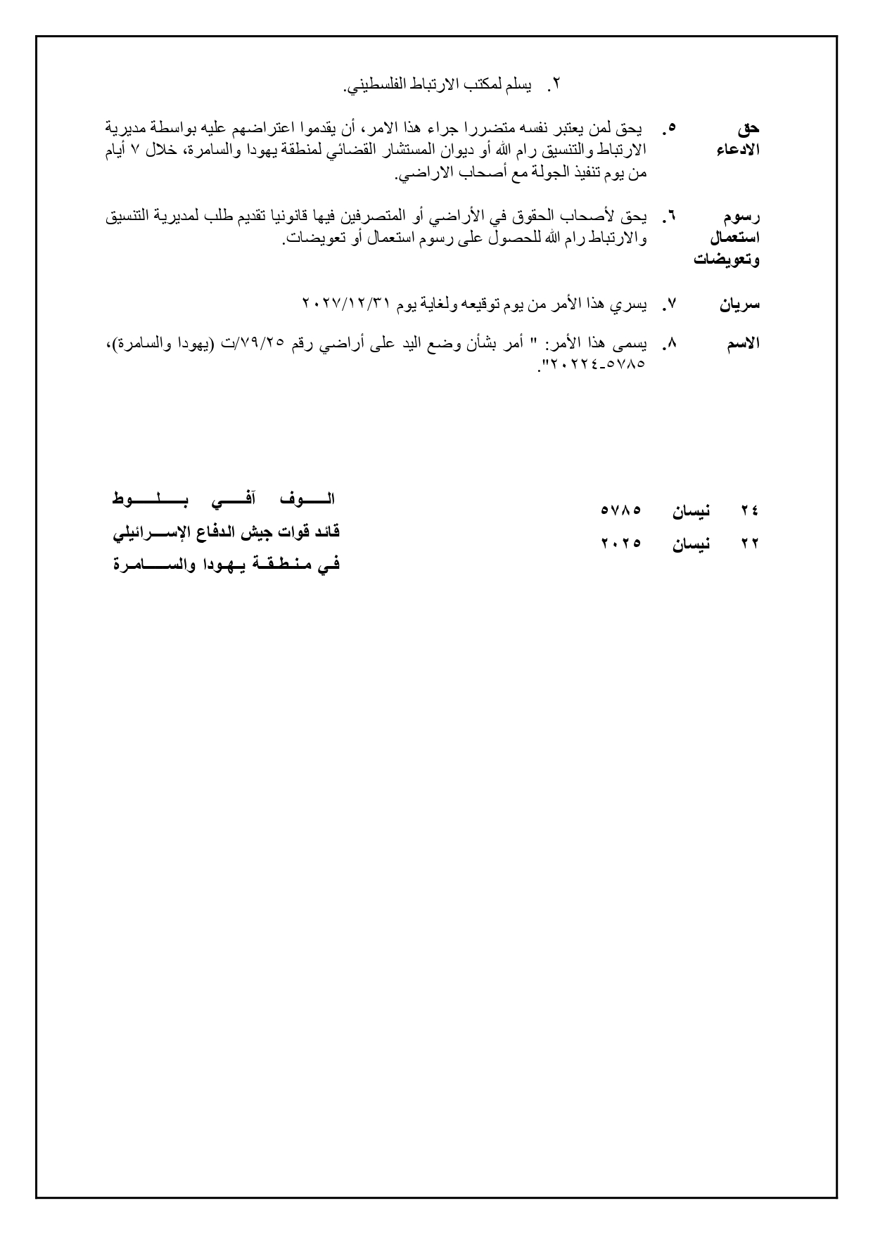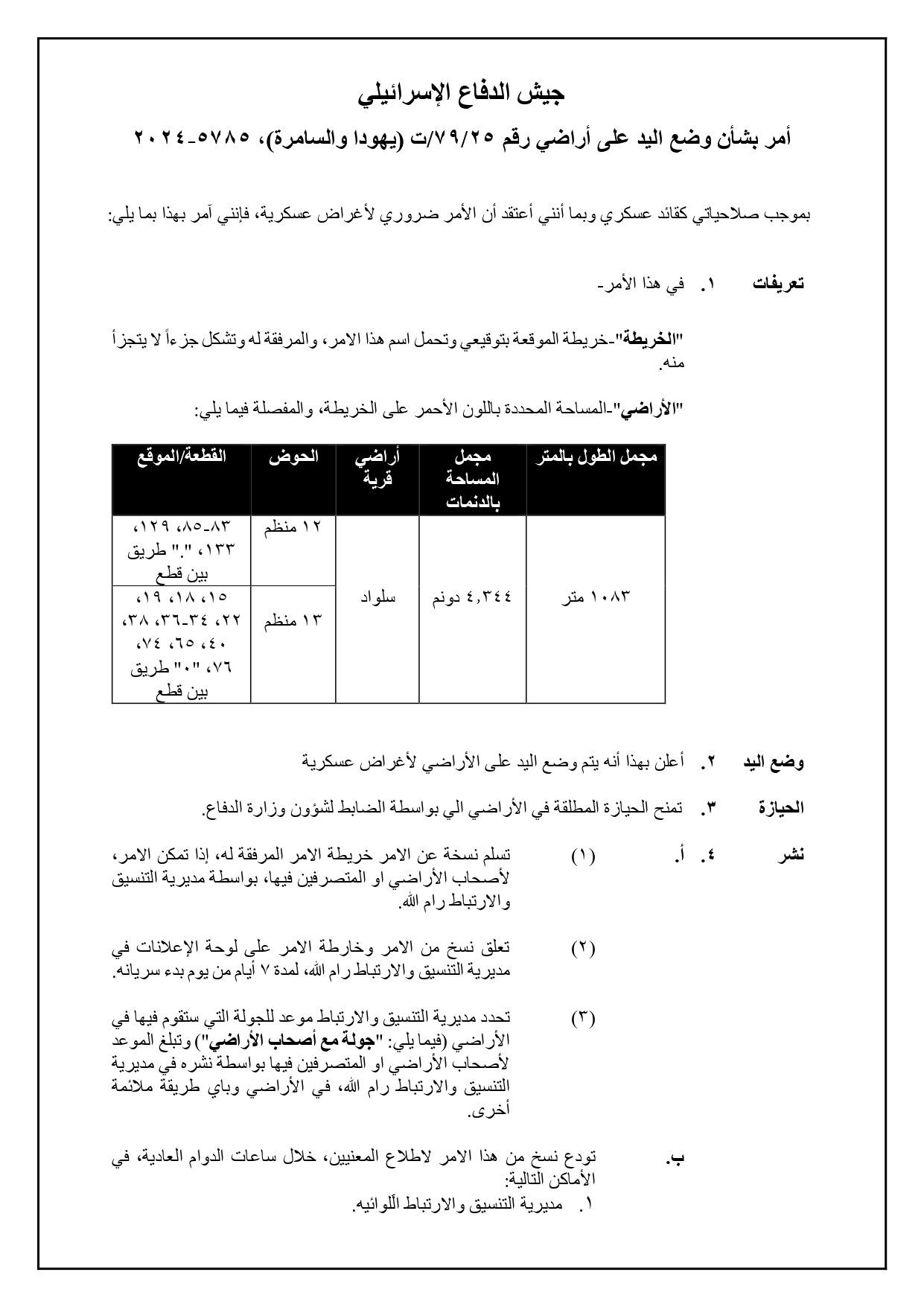 أصدر ما يسمى بقائد جيش الاحتلال في الضفة الغربية المدعو " الوف بلوط" في مطلع شهر نيسان الحالي أمراً عسكرياً يتضمن الاستيلاء على أربعة دونمات زراعية من أراضي بلدة سلواد الواقعة بالقرب من معسكر العاصور جنوب شرق البلدة، تحديداً ضمن الأحواض الطبيعية "12" و "13" .