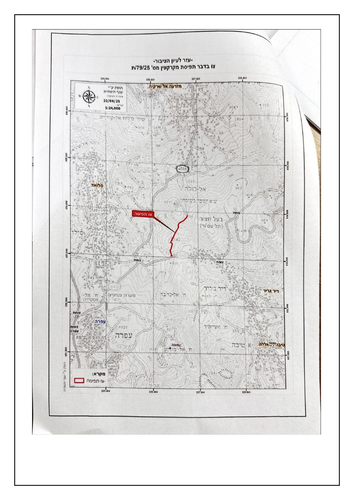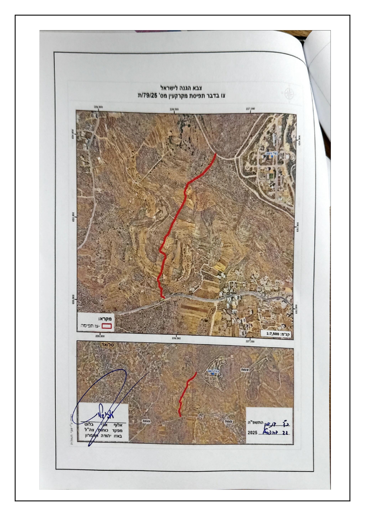 وبموجب هذا الأمر العسكري الجديد والذي جاء تحت عنوان أمر وضع اليد على أراضي (25/79/ت) والمتضمن الاستيلاء على أربعة دونمات وبحسب الخارطة العسكرية المرفقة، فإن الاحتلال يخطط لإقامة طريق عسكري رابط بين معسكر العاصور وبين الطرق الالتفافية المقامة هناك، بطول 1000متر، بحيث يخدم مخططات الاحتلال العسكرية.
