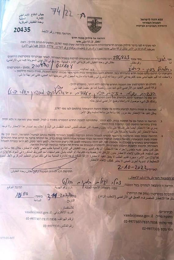وكانت سلطات الاحتلال قد استهدفت هذه المباني عبر إخطار بعنوان "إخطار بإزالة مبنى جديد"، يحمل الرقم (20435)، صادر عن ما يسمى بـ"الإدارة المدنية – لجنة التفتيش المركزية"، بتاريخ (2/10/2022).