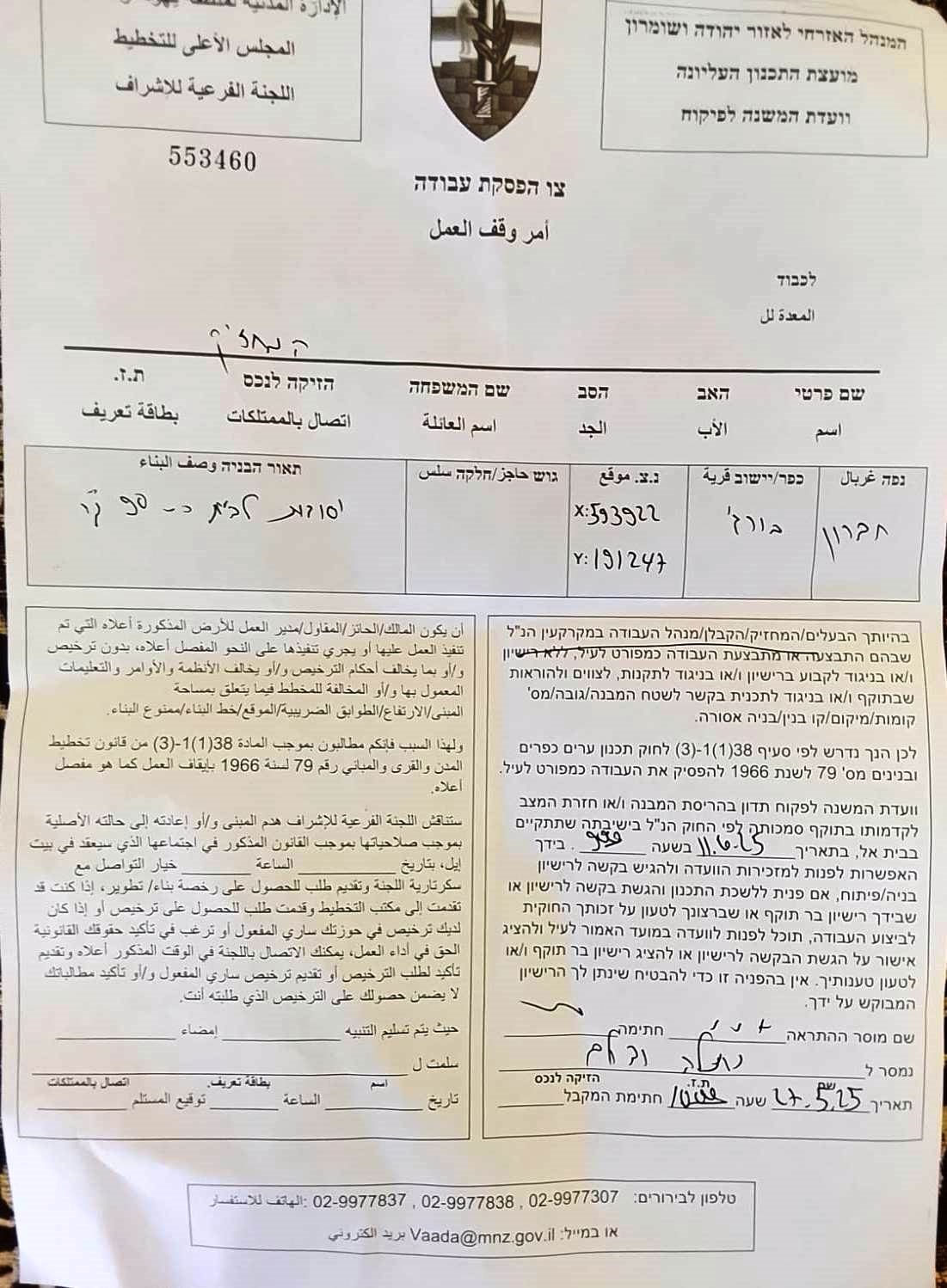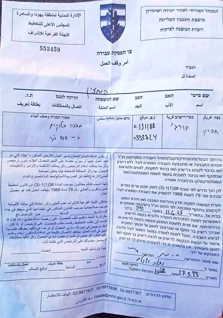 إخطار وقف العمل رقم 553460 الذي استهدف منزل المواطن رائد حجة