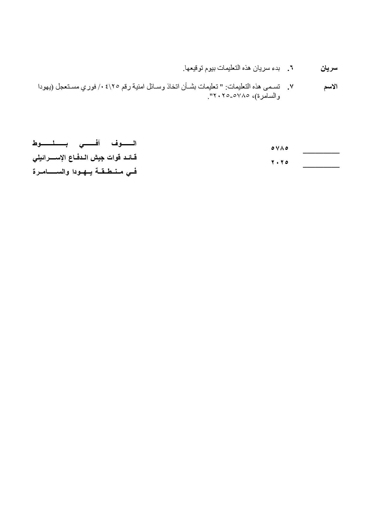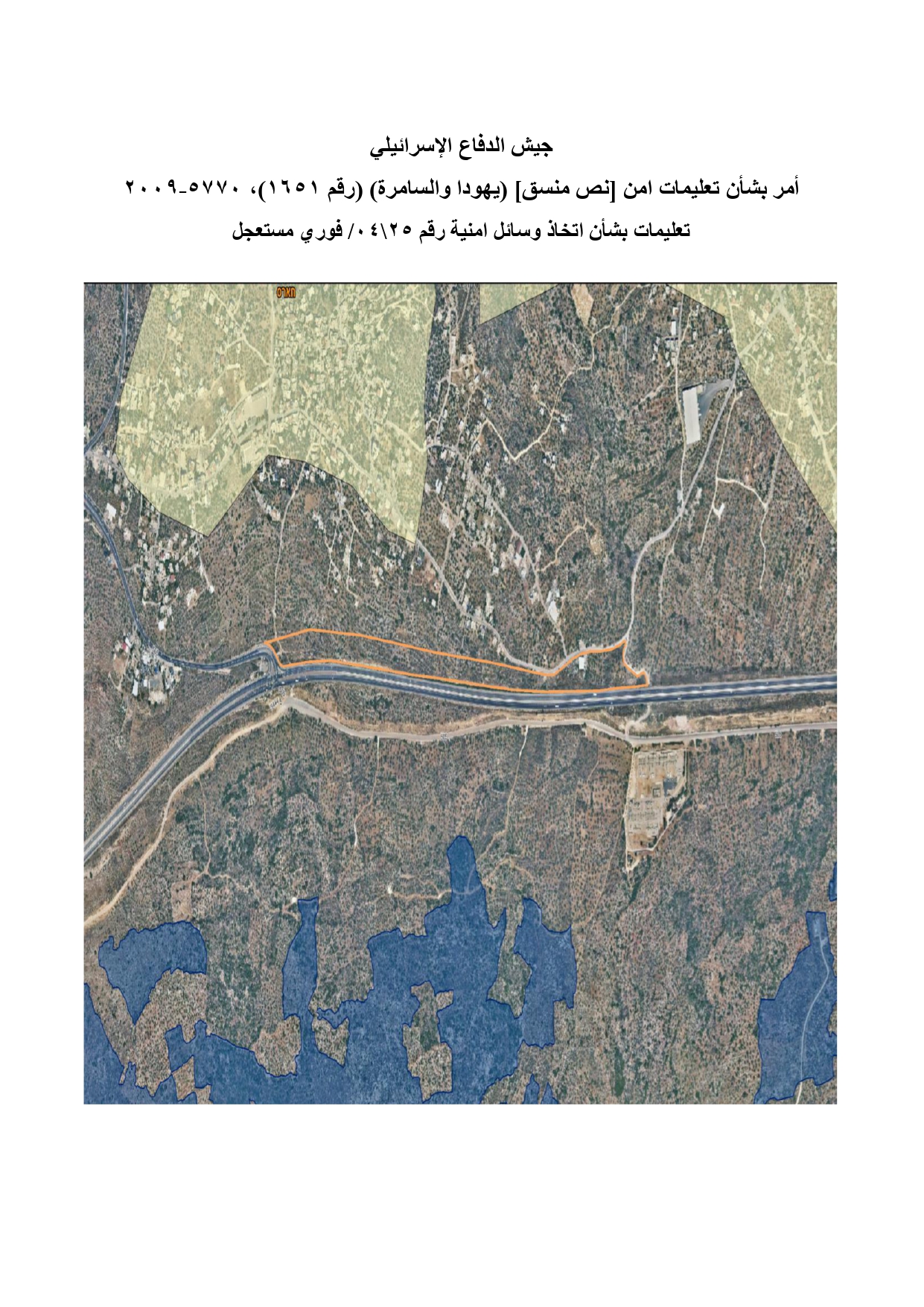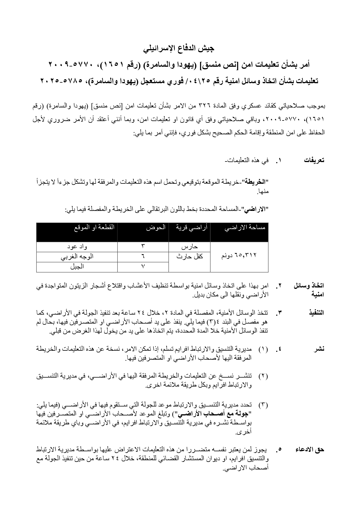 يذكر ان أعمال التجريف تأتي استناداً لأمر عسكري إسرائيلي موقع من قبل ما يسمى "الوف بلوط" قائد جيش الاحتلال في الضفة الغربية والصادر في شهر نيسان من العام 2025م، حيث جاء الأمر بعنوان " أمر بشان اتخاذ وسائل أمنية مستعجلة (25/4/ فوري ومستعجل)" والذي ينص باستهداف 65 دونماً من أراضي القريتين وفق ما يلي: