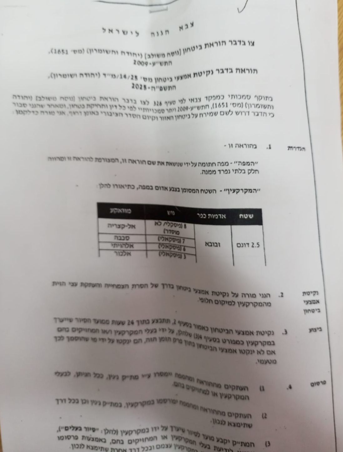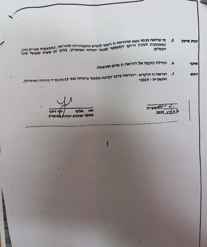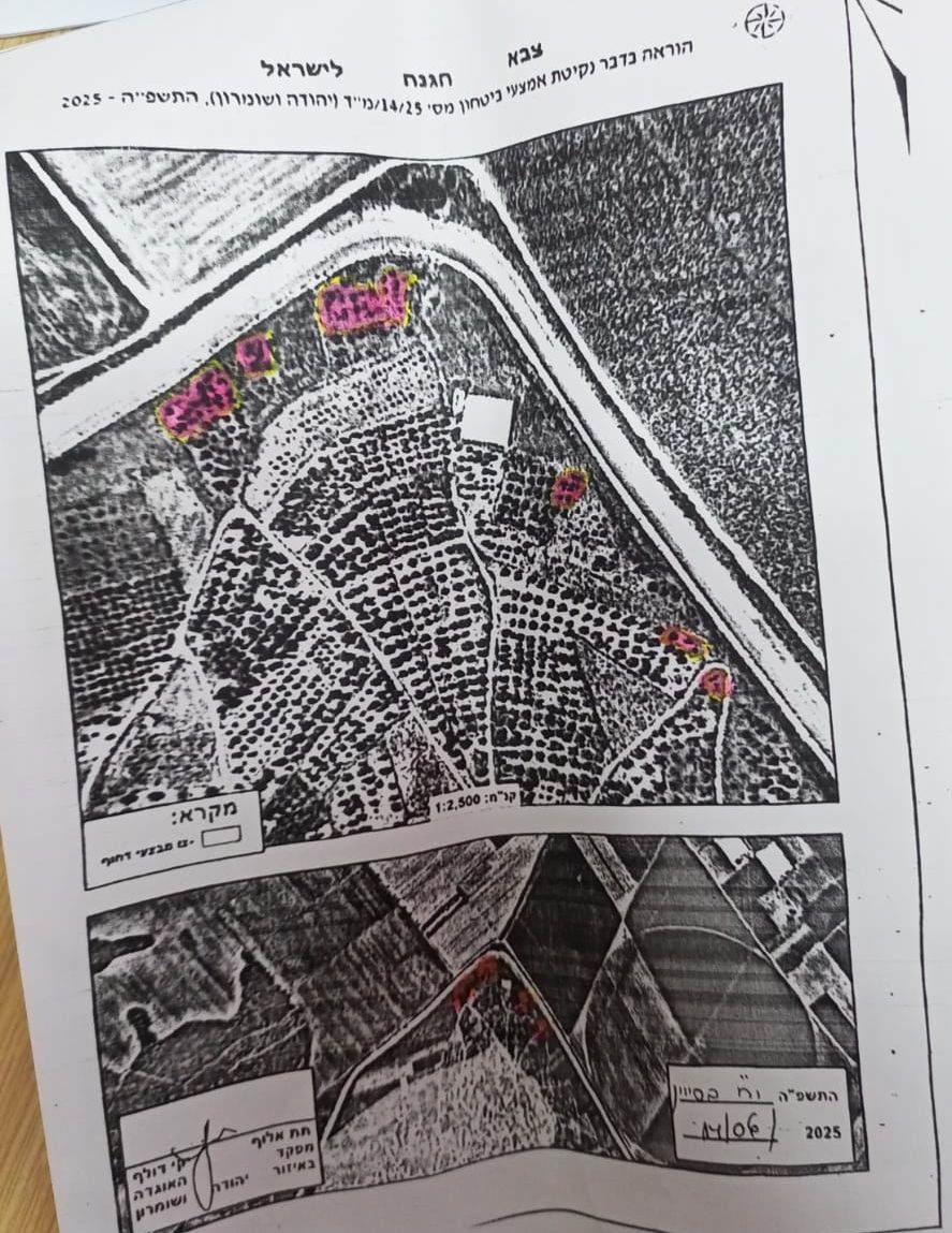 | في 09 حزيران 2025 أصدر الاحتلال أمراً عسكرياً باقتلاع أشجار زيتون " حوالي 60 شجرة" من أراضي بلدة حوارة / محافظة نابلس | أمر بشأن اتخاذ وسائل أمنيه"رقم 25/13/ فوري ومستعجل | 2.8 | |