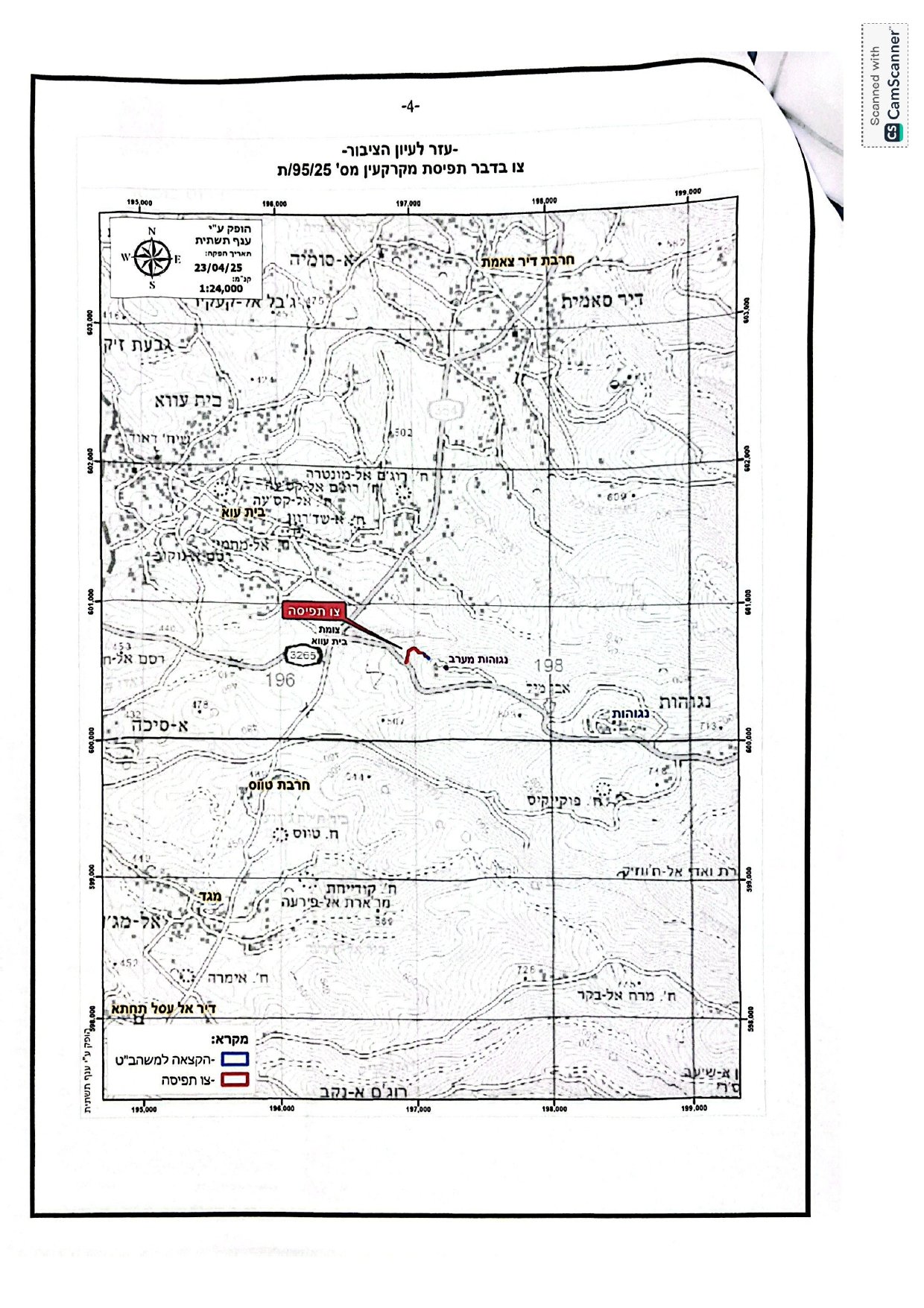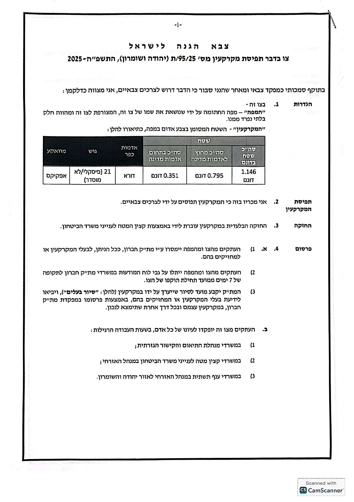 ويحمل الأمر العسكري الرقم ( 95/25/ت)، وجاء بعنوان " أمر لوضع اليد على أراضي" جاء فيه بأن جيش الاحتلال سيضع اليد على جزء من الأراضي الواقعة في الحوض الطبيعي رقم ( 21) بموقع ( فقيقيس) من أراضي بلدة دورا، وذلك لإحتياج عسكري- وفق الأمر.