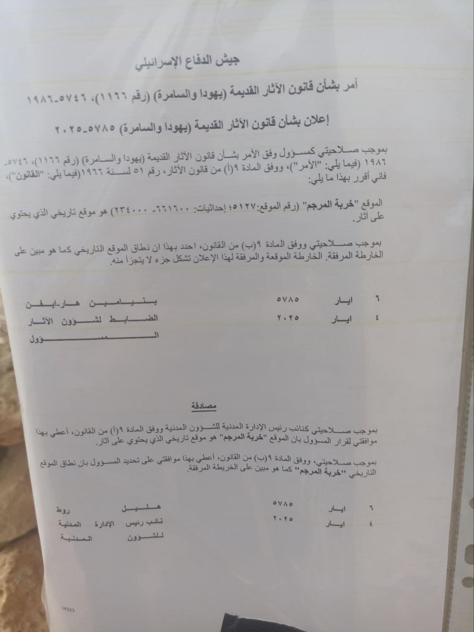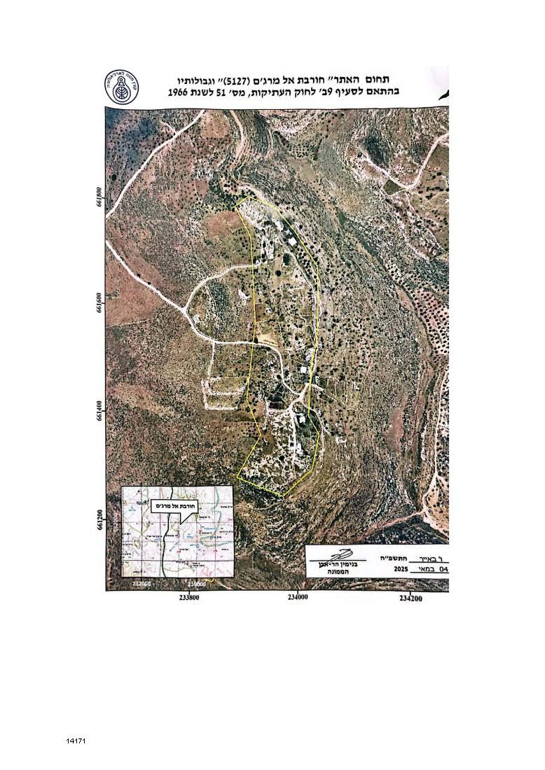 أصدر ما يسمى "بنيامين هار ايفن" الضابط لشؤون الآثار في ما تسمى بالإدارة المدنية الإسرائيلية في الرابع من أيار من العام 2025م، أمر عسكري جاء تحت عنوان " أمر بشأن قانون الآثار القديمة رقم 5758-2025"، والذي جاء فيه وبحسب الخارطة المرفقة معه الاستيلاء على موقع خربة المراجم الأثري الواقع الى الجنوب من قرية دوما.
