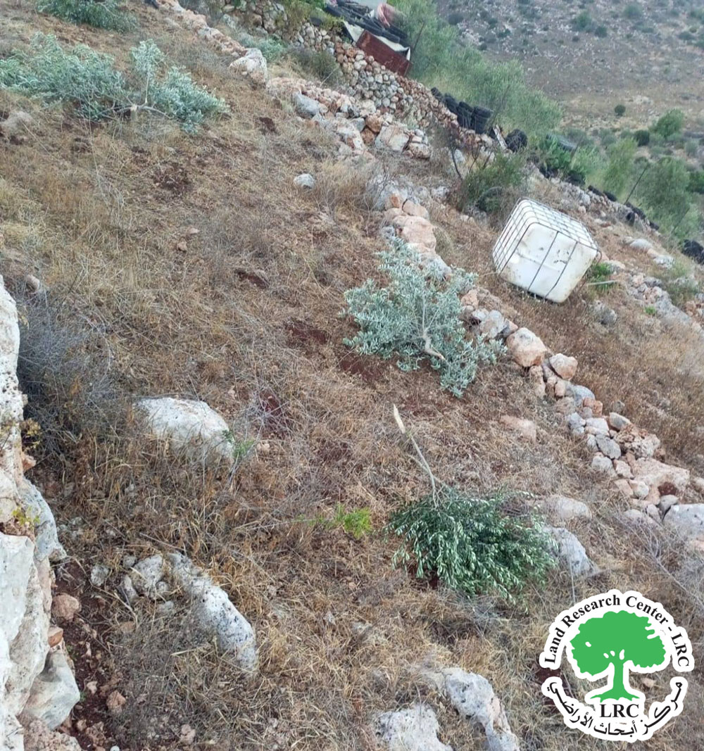 ‘’One years ago, I rehabilitated a piece of land I own in al Ras area, over past years it was planted with wheat and recently I replanted the land with olive trees to protect the land from settlers’ practices, as they tried to take control many times, prior that they cut several numbers of trees and damaging to several farmers in the same town and same location. Although I was existed in the land and checking up it, I noticed settlers around the area and documented me when I check up my land. In the morning of Thursday, prior day of Eid Al Adha, when I went to my land, I shocked that settlers cut and damage my trees, immediately I decided to replant it although the challenges that I faced.’’
