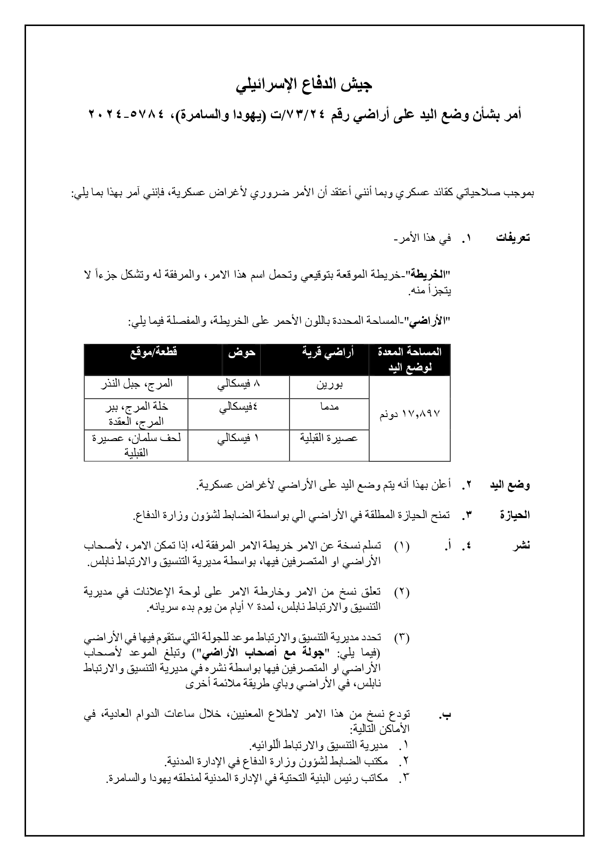 وبحسب الأمر العسكري الذي يحمل الرقم (24/73/ت)، 5748-2024 والذي جاء تحت عنوان أمر وضع اليد على أراضي، فقد حدد الاحتلال بموجبه الأحواض والقطع التالية للمصادرة: