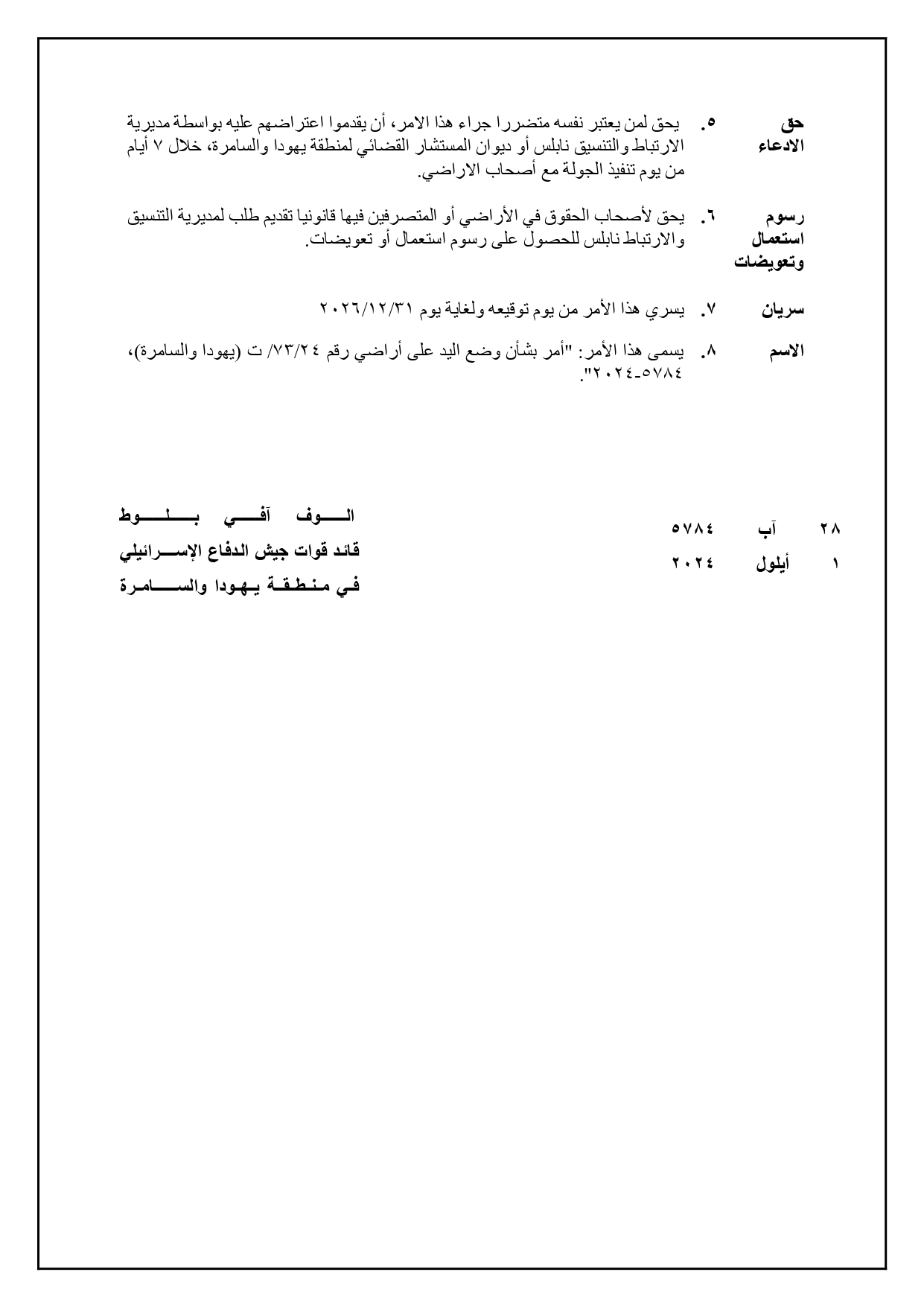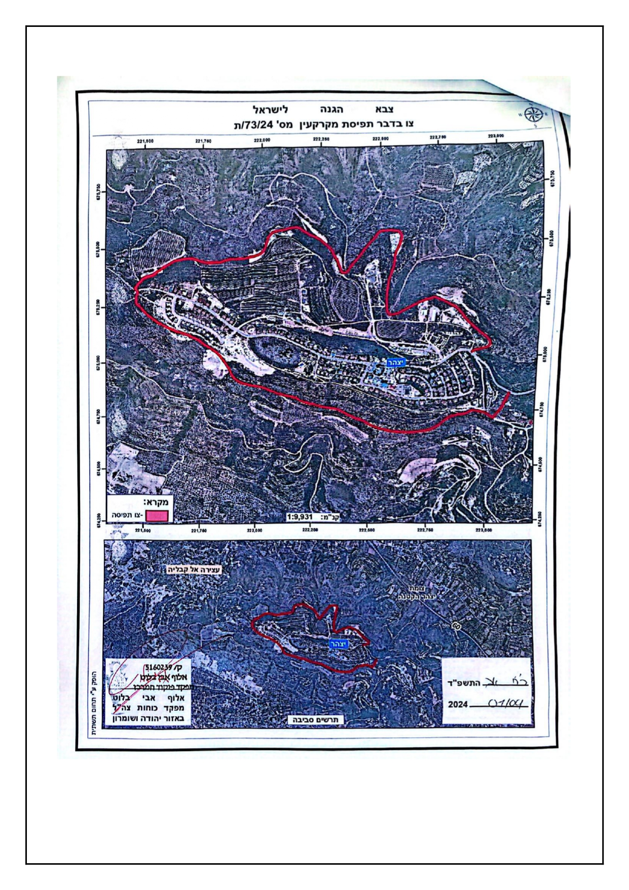 أصدر ما يسمى قائد جيش الاحتلال الإسرائيلي في مطلع شهر أيلول الحالي 2024م، أمراً عسكرياً يتضمن الاستيلاء على  (17.8 ) دونماً من أراضي قرى جنوب محافظة نابلس والمتاخمة لمستعمرة "يتسهار"، وذلك " لأغراض عسكرية" حسب ما جاء في الأمر.