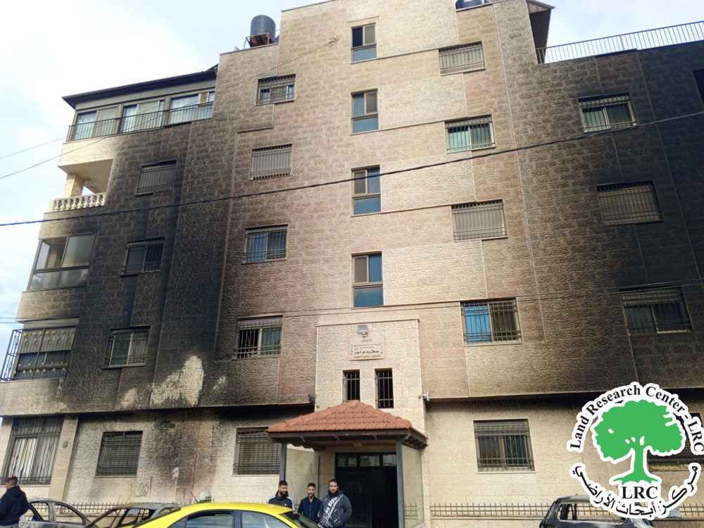 تضرر واجهة البناية بفعل الحريق الذي أشعله المستعمرون في السيارات
