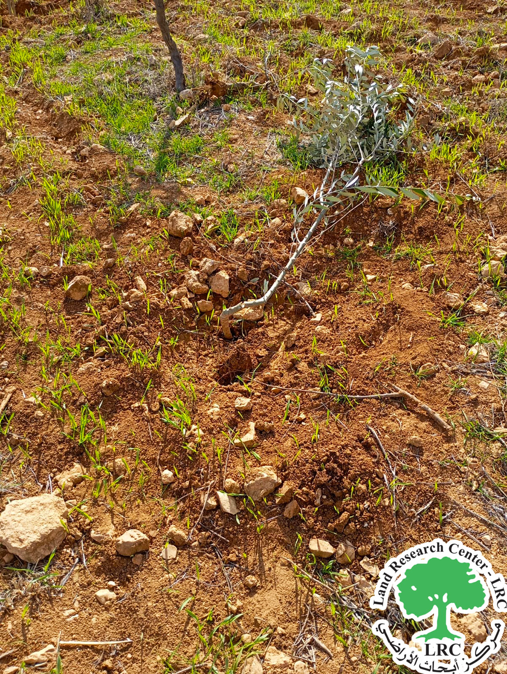 " في شهر آب من عام 2024 قام المستعمرون برعي أبقارهم في أرضي المزروعة بأشجار الزيتون مما ألحق بها ضرراً كبيراً، بعد أن قامت الأبقار بتخريب الأشجار، وقام المستعمرون الرعاة بتخريب ما تبقى منها، وفي مطلع شهر كانون الثاني 2025 قمت بإعادة زراعة أرضي بأشتال زيتون جديدة وكبيرة، وزرعت فيها 120 شتلة يبلغ عمر الشتلة الواحدة حوالي ثلاث سنوات، فقمت بزراعتها على مساحة حوالي 10 دونمات، وبدأت اعتني بها، لكن المستعمرون قاموا بتقطيعها على مرتين، ففي تاريخ 14/1/2025 قام المستعمرون وعبر أدوات حادة ظهرت على الاشتال بتقطيع وتكسير 20 شتلة منها، ثم عادوا في تاريخ 21/1/2025 وقطعوا حوالي 80 شتلة أخرى، وبالتالي يكون المستعمرون قد دمروا 100 شتلة من اللاتي زرعتها حديثاً كبديل للأشجار التي خربوها في العام الماضي".