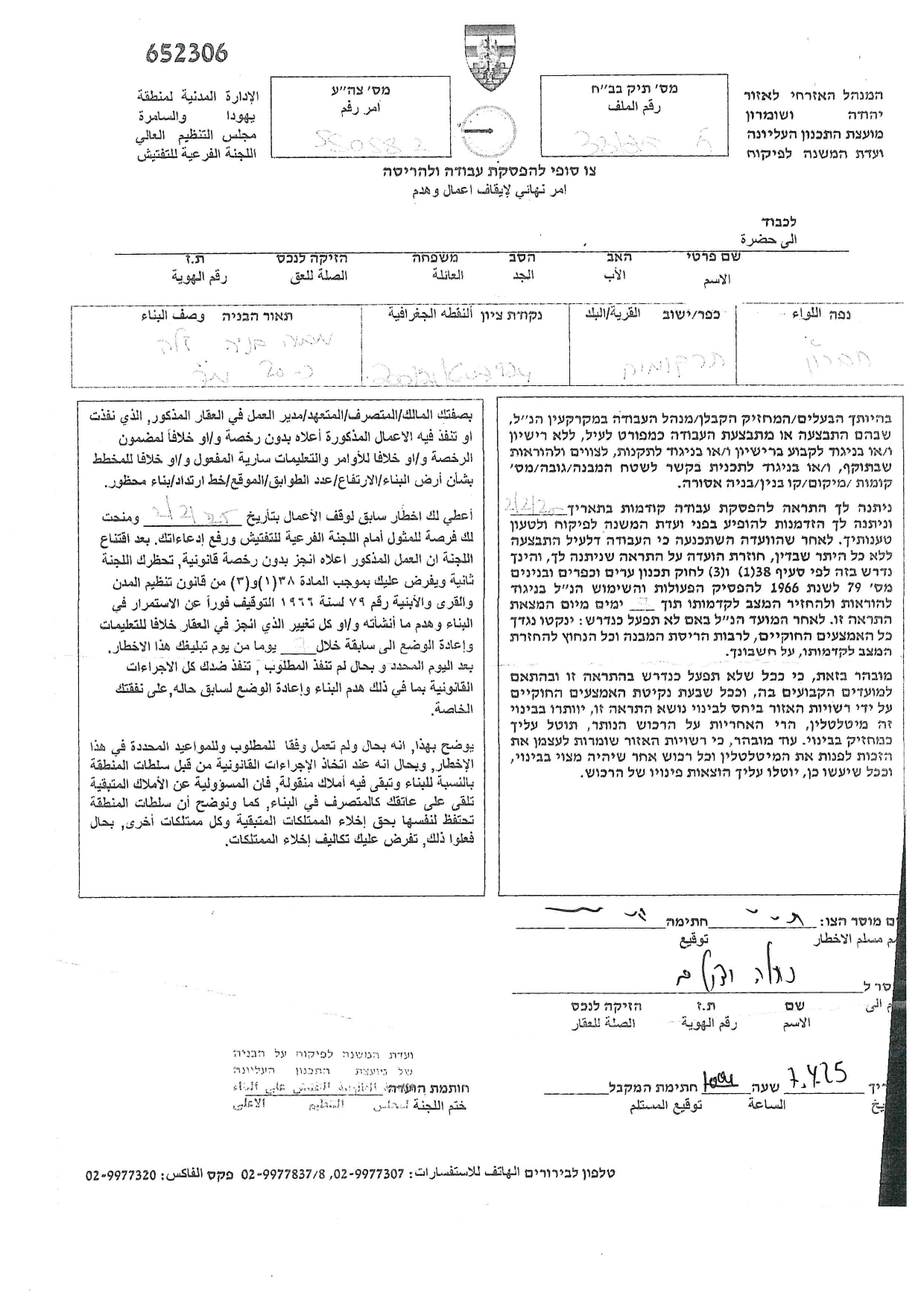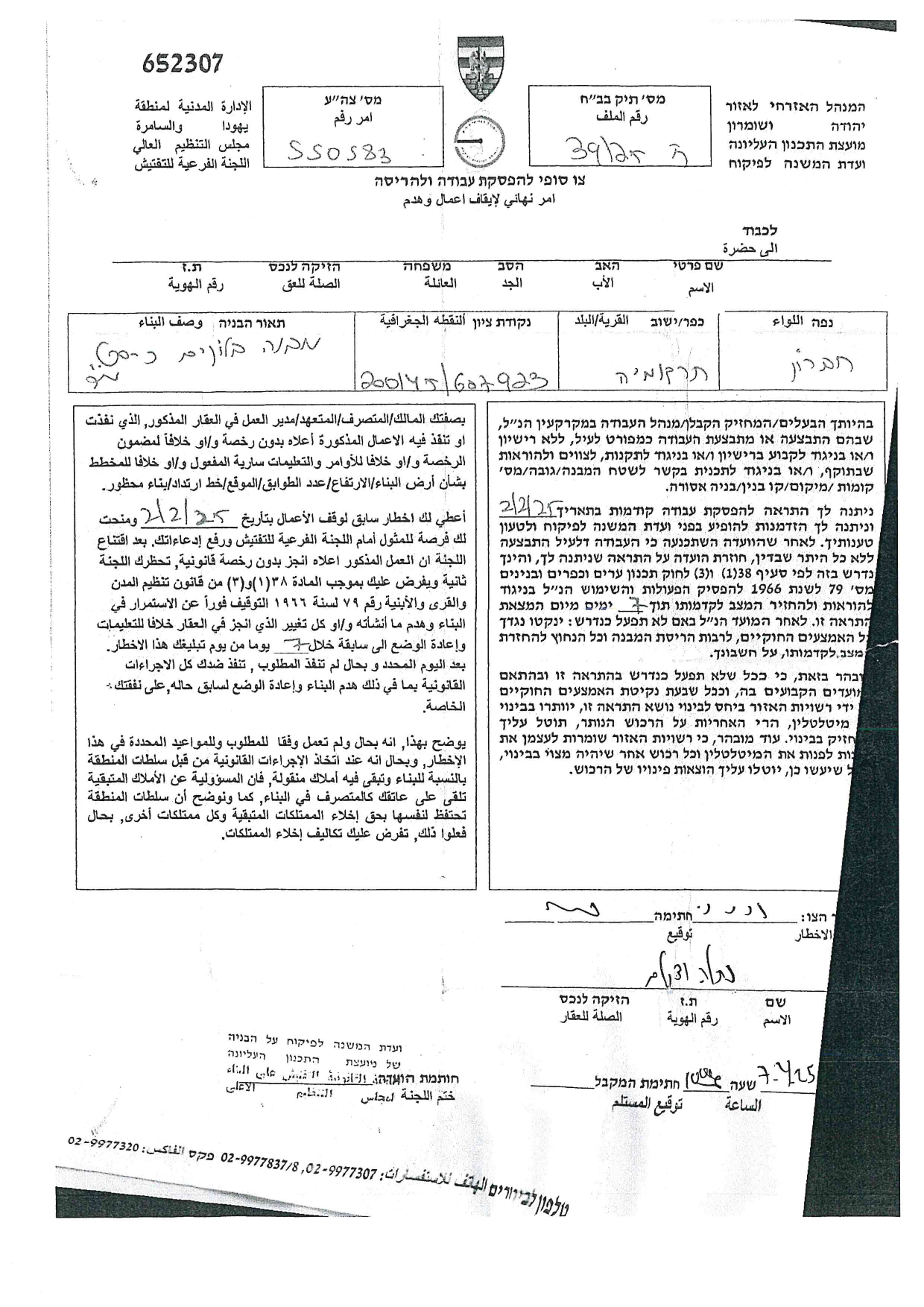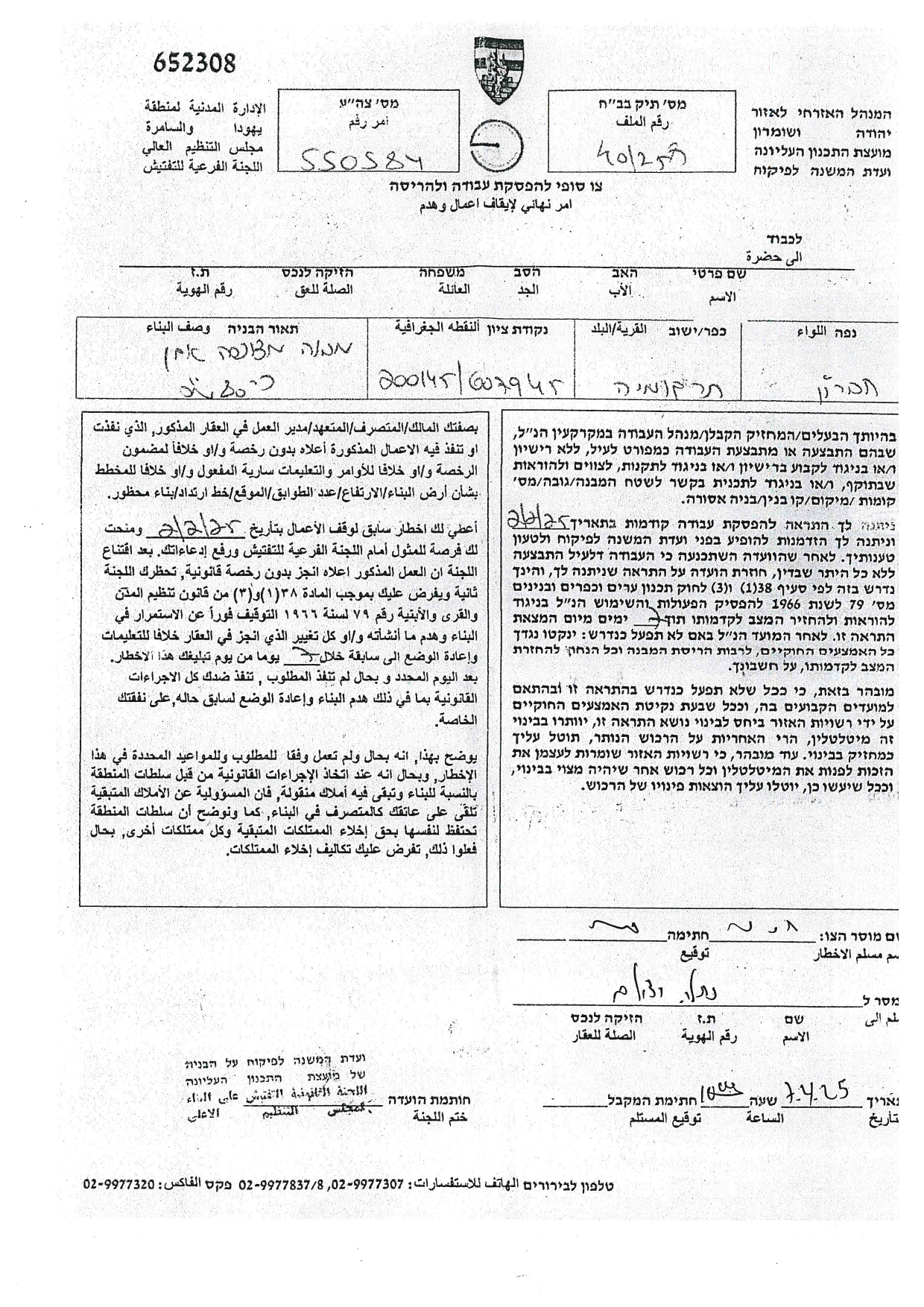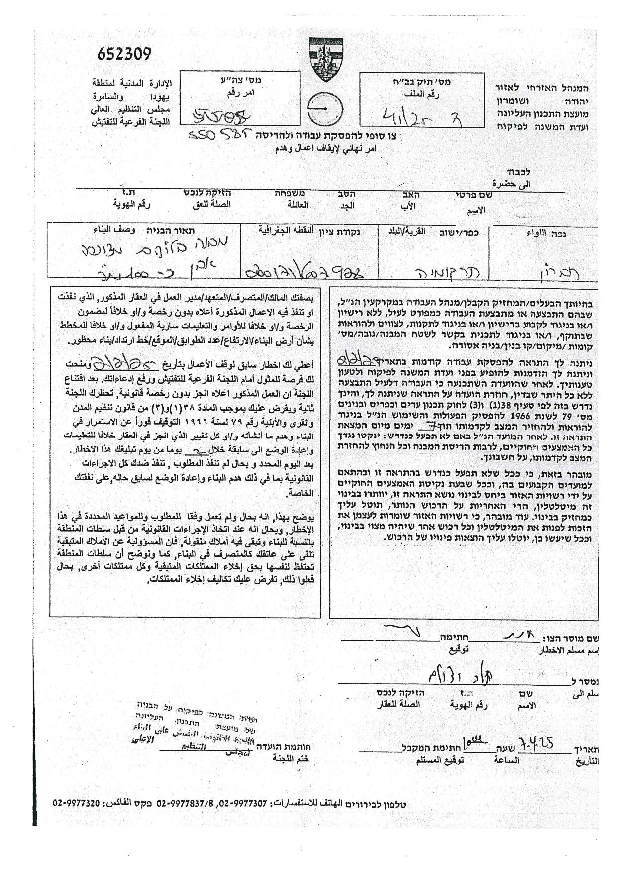 كما حددت سلطات الاحتلال في متن إخطاراتها تاريخ ( 27/4/2025) موعداً لانعقاد جلسة لما يسمى باللجنة الفرعية للتفتيش، التي ستعقد جلستها في مقرها بمستعمرة " بيت ايل" وستناقش فيها ما أسمته " هدم البناء أو إرجاع المكان إلى حالته السابقة".