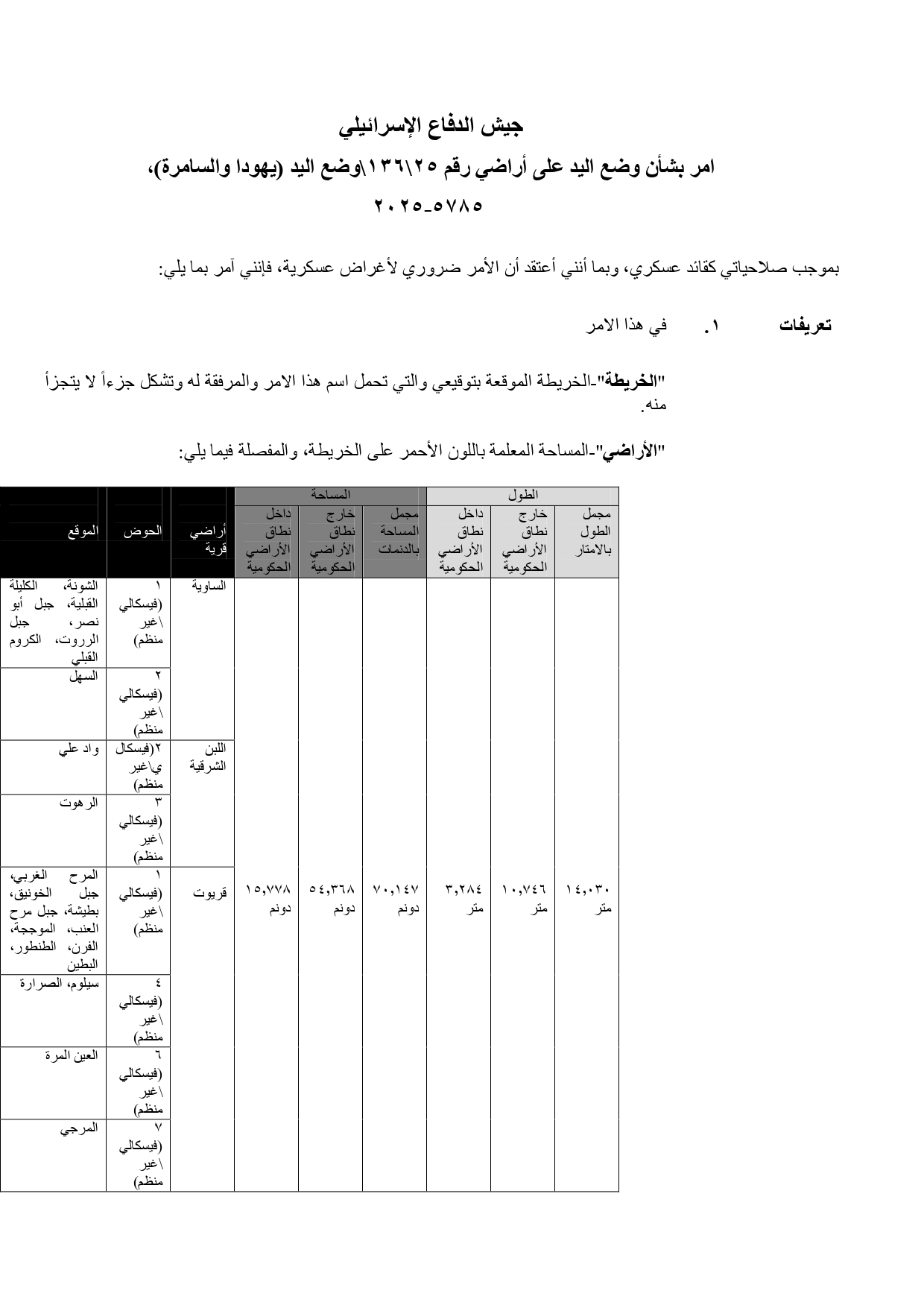 أصدر ما  يسمى قائد جيش الإحتلال الإسرائيلي في الضفة الغربية المدعو " الوف بلوط" في تاريخ 21 من شهر أيلول من العام 2025م، أمراً عسكرياً جديداً، جاء تحت عنوان "أمر بشان وضع اليد على أراضي  رقم 25/136/ وضع اليد (يهودا و السامرة)  والذي تضمن   الاستيلاء  على 70.14 دونماً  من ضمنها (54.3 دونما مملوكة ملكية خاصة و 15.77 مصنفة أراضي حكومية) والتي تعود في ملكيتها إلى مجموعة  من المزارعين   من قرى  قريوت واللبن الشرقي والساوية جنوب محافظة نابلس.
