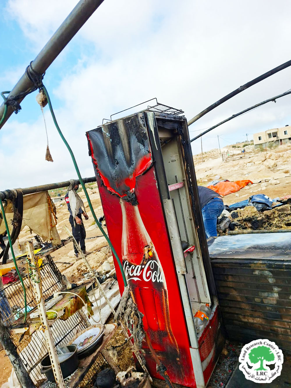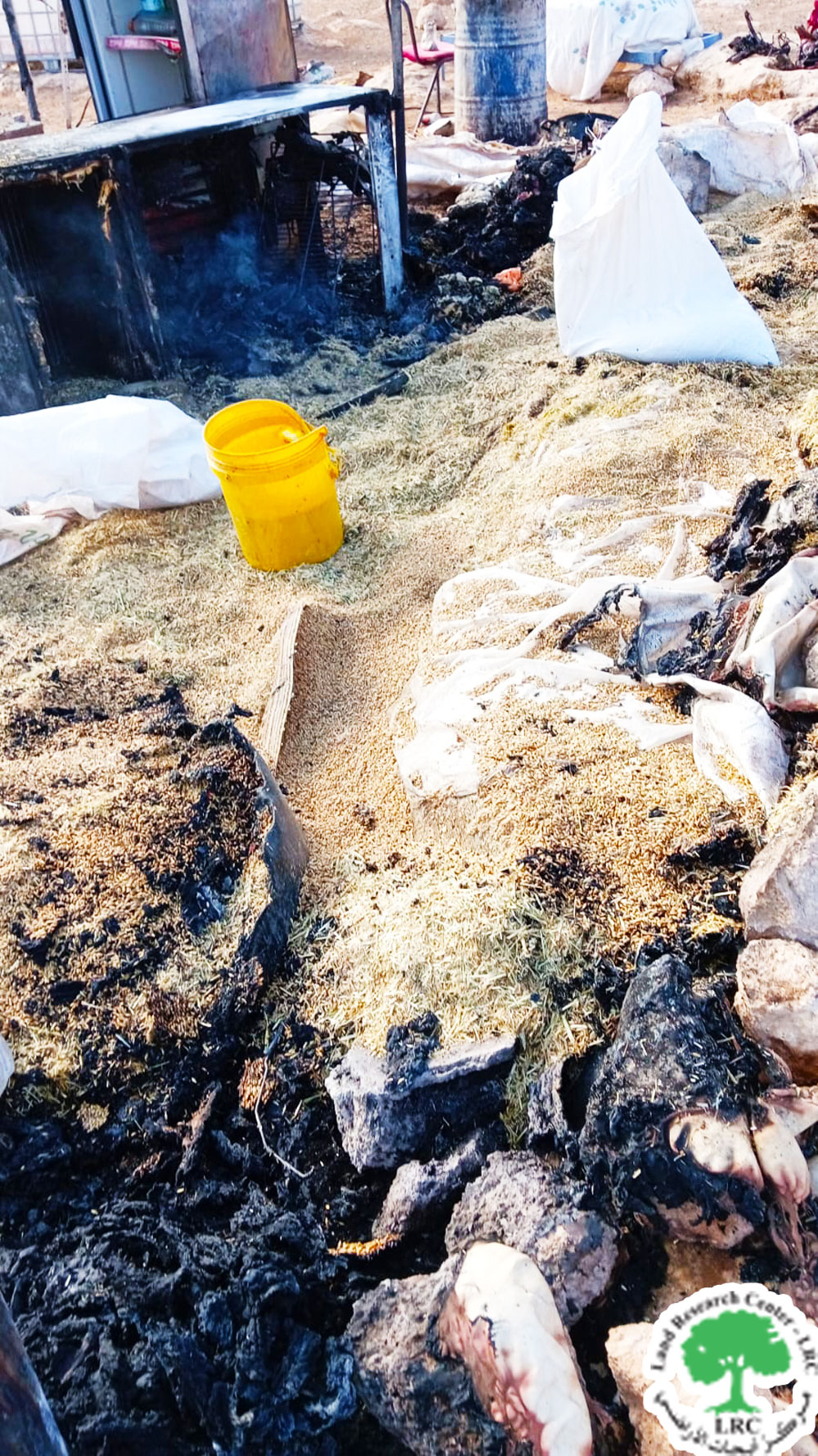 " غادر والدي المسكن في ساعات الصباح متوجهاً إلى بلدة يطا، وفي حوالي الساعة السابعة والنصف تلقينا إتصالاً من مزارعين مقابلين للخيمة بأن المستعمرين قد أحرقوا الخيمة، وقالوا لنا بأن ثلاثة مستعمرين يركبون دراجة زراعية رباعية الدفع، قد اقتحموا الخيمة، وألقوا نحوها زجاجة حارقة، ثم اشتعلت فيها النيران بسرعة، فهرعنا إلى الموقع وقمنا بإطفاء النيران من مياه خزان بلاستيكي كان في المكان، لكن النيران أحرقت الخيمة وما فيها من مقتنيات، كما أتت النيران على أكياس أعلاف كانت بالقرب من الخيمة وأحرقتها وألحقت ضرراً في الأعلاف التي باتت لا تصلح لإطعامها للمواشي".