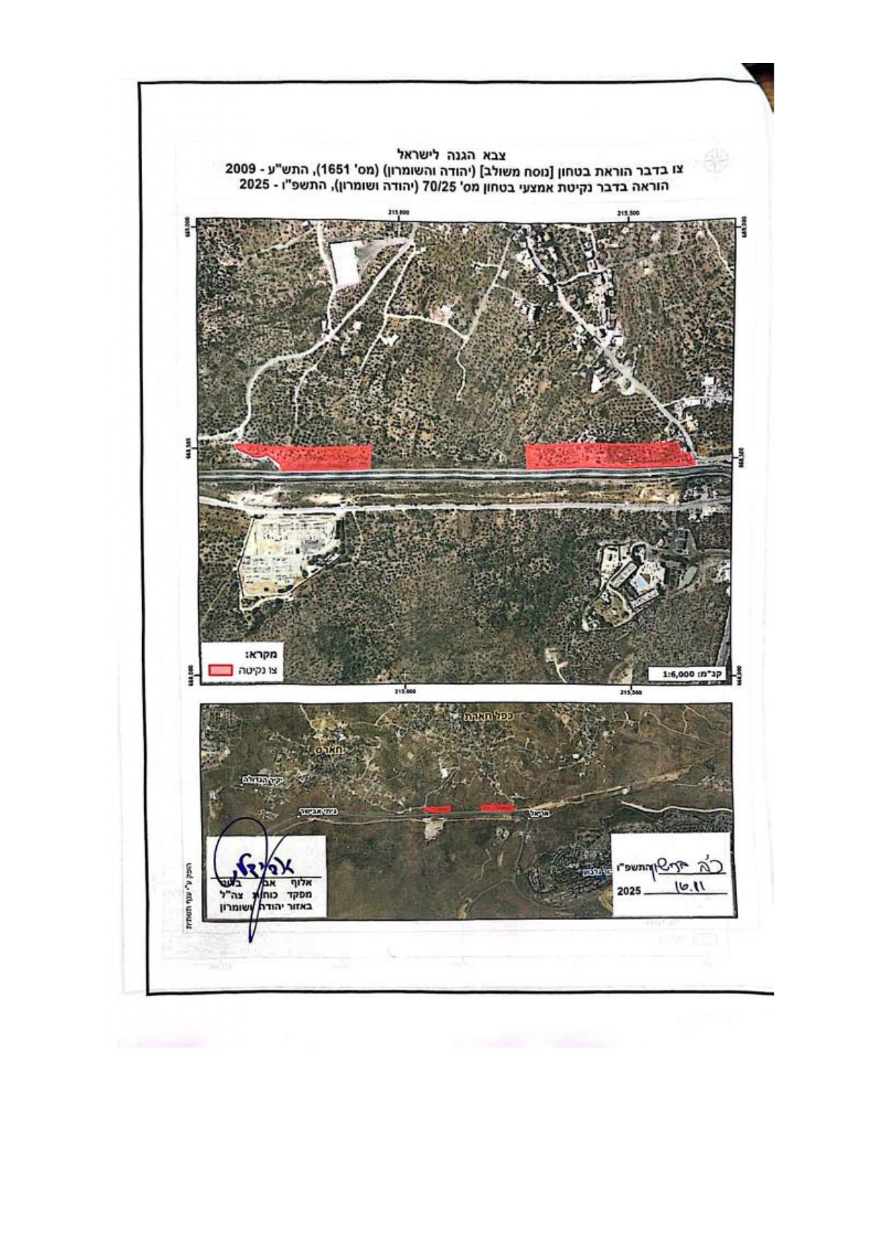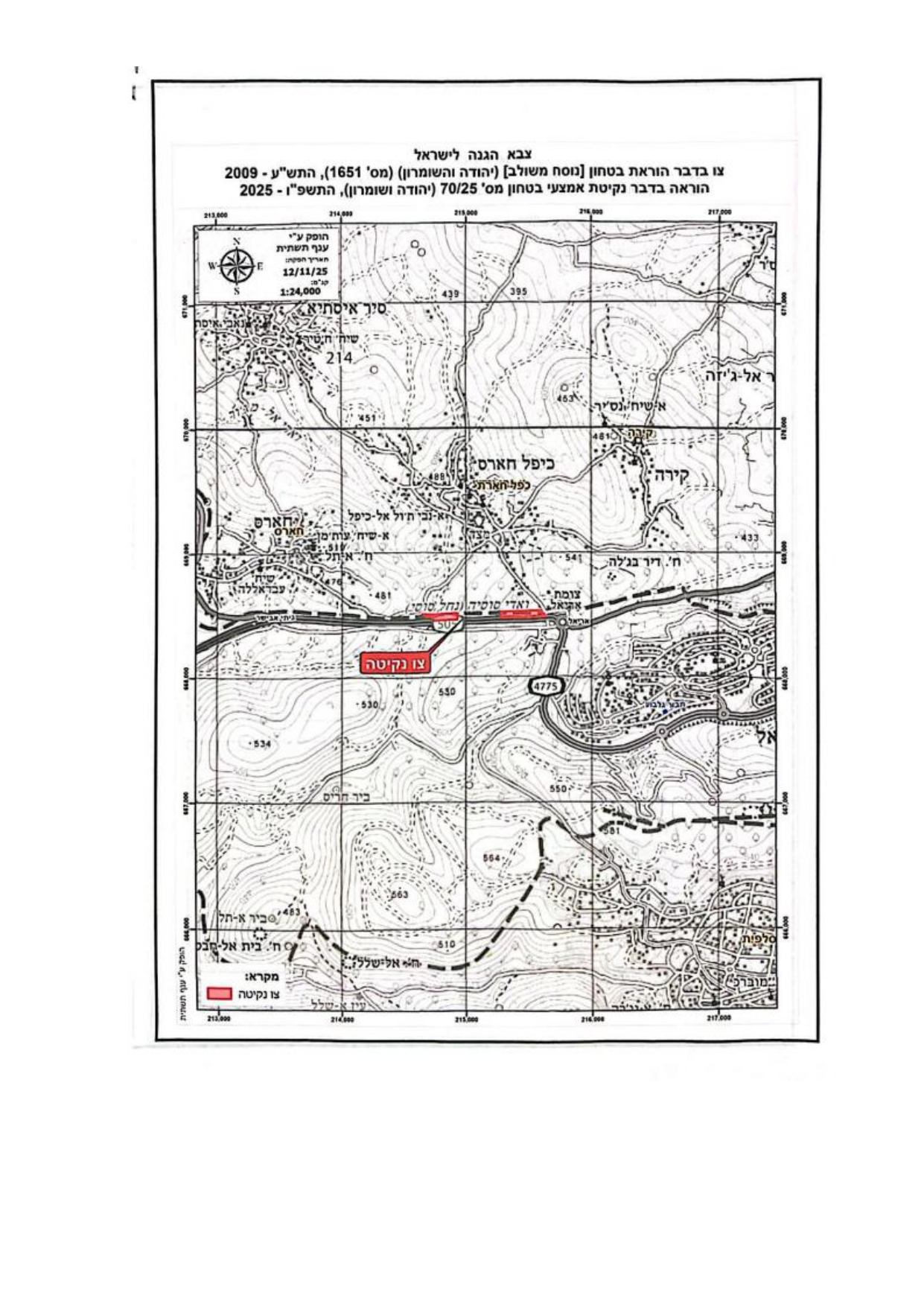 أصدر ما يسمى بقائد جيش الاحتلال في الضفة الغربية المدعو " الوف بلوط" في تاريخ 16 تشرين الثاني من العام 2025م، أمراً عسكرياً جديداً بإزالة أشجار زيتون من عدد من القطع الزراعية في أراضي بلدة كفل حارس شمال مدينة سلفيت، تحديداً تلك الواقعة ضمن الحوض الطبيعي 6 مواقع الدوير والوجه القبلي والراس، وأيضا ضمن الحوض الطبيعي رقم 7 موقع الجبل.