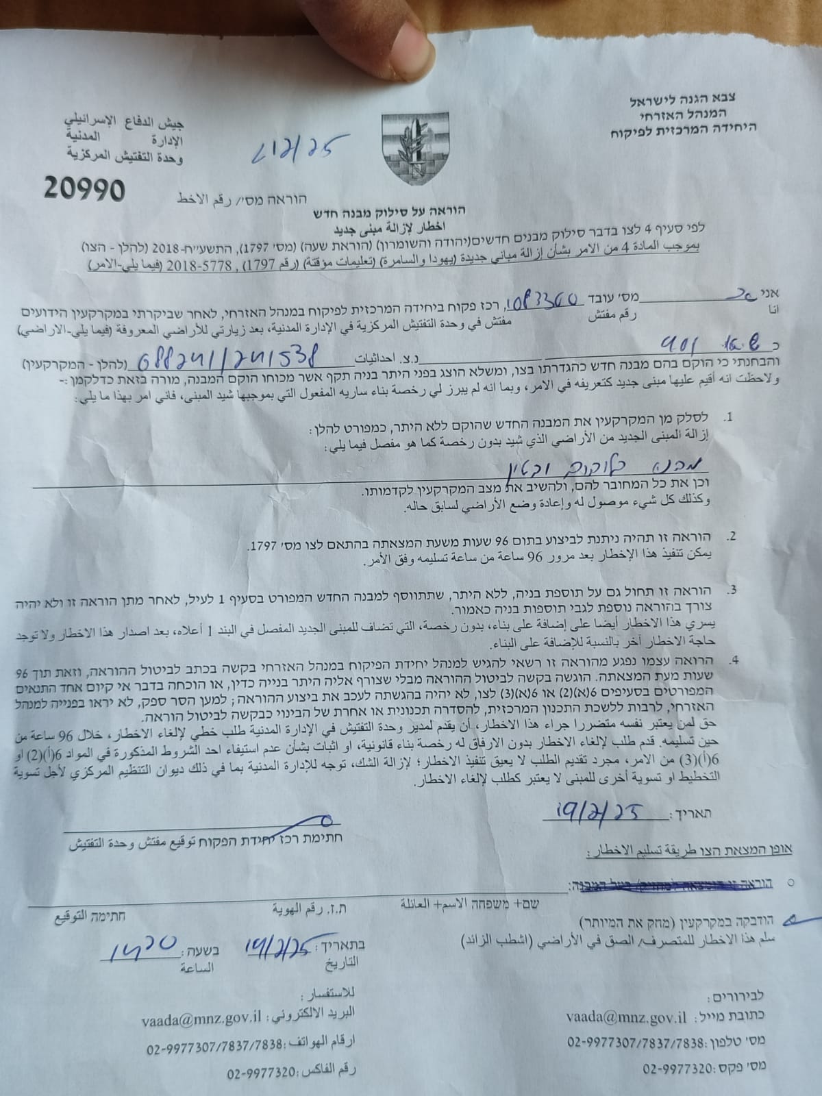 The Israeli occupation uses such types of notification, which include demolition orders within 96 hours, to prevent construction in Area C and speed up the demolition process in the Jordan Valley. The field researcher observed a large number of structures targeted by this type of notification , in which is common and essential method for limiting construction, it also contributes to preventing any affected farmer from submitting a permit application, and speeding up the demolition process and displacing citizens.