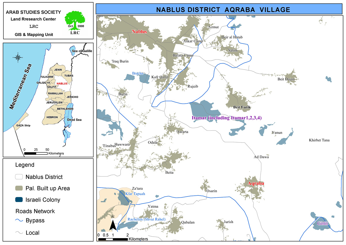 ‘’We, the resident of Aqraba are suffering from settlers and occupation’s practices on the lands of town. Khirbet Al Taweel located east town has had al structures demolished three times in les than three months, today a new colonial outpost is being establish to the east of town. The existence of this outpost will be a miserable due to the attacking of settlers will be increase and preventing farmers from accessing their lands, which amounted 500 dunams planted with olive, also settlers and occupation closed off the road linking between Aqraba and Majdel Bani Fadel, causing a serve damage in the future.’’