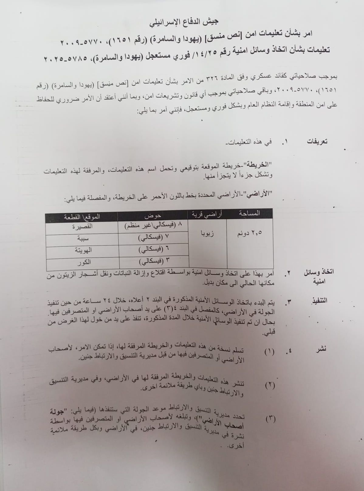 It’s worth noting that this action was preceded by several other orders, either (an order regarding the seizure of land – urgent and immediate) or (an order concerning security instructions, urgent and immediate). These orders have targeted lands planted with trees located near either a bypass/ settler, settlement/ annexation and expansion wall, below are the most notable cases documented by LRC at the beginning of 2025 and until the date of this report:
