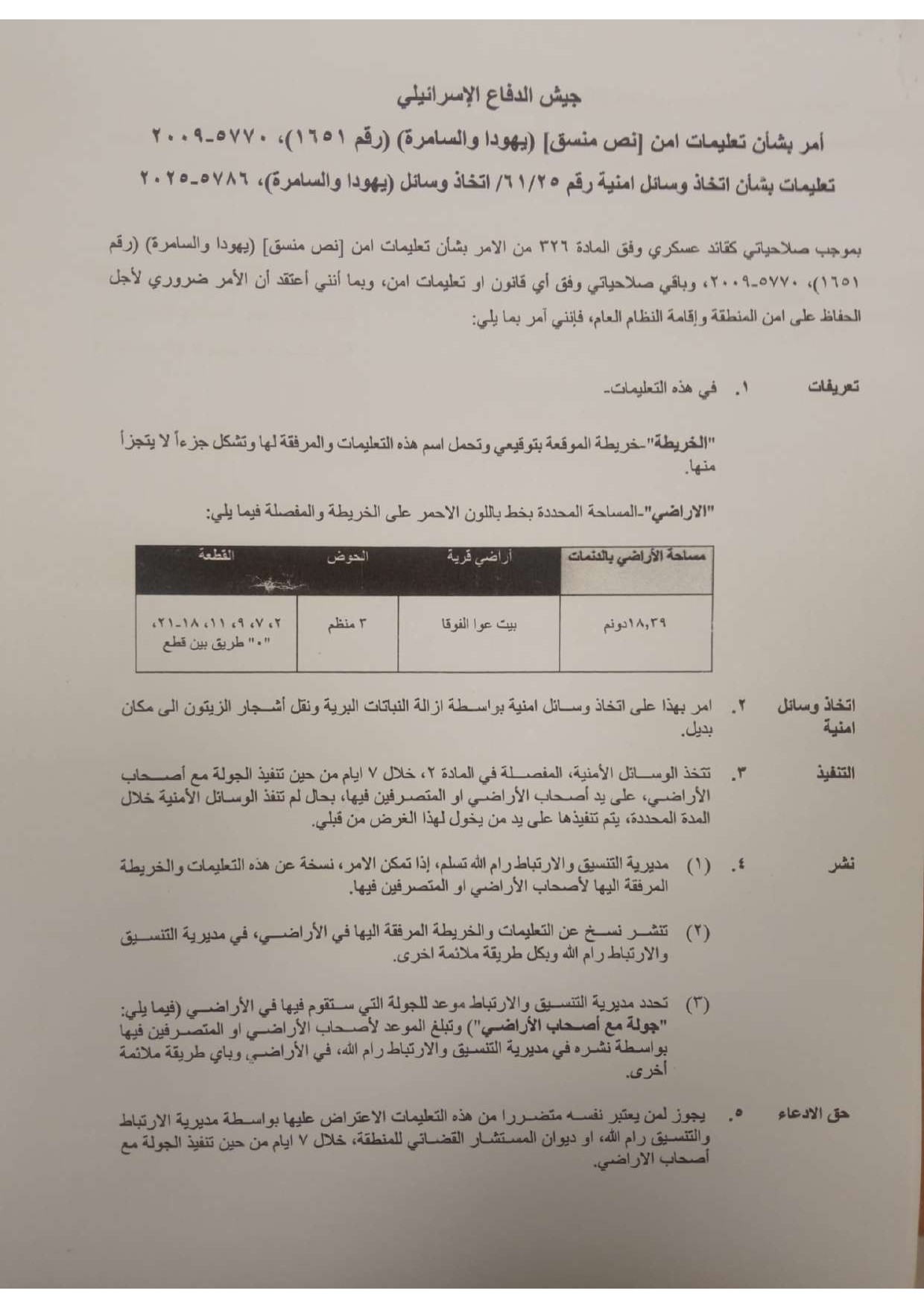 • 2025-08-07 The Israeli Military Occupation Notifies 40 Fruitful Olive Trees with Removing in Al Nabi Salih Village/ North Ramallah