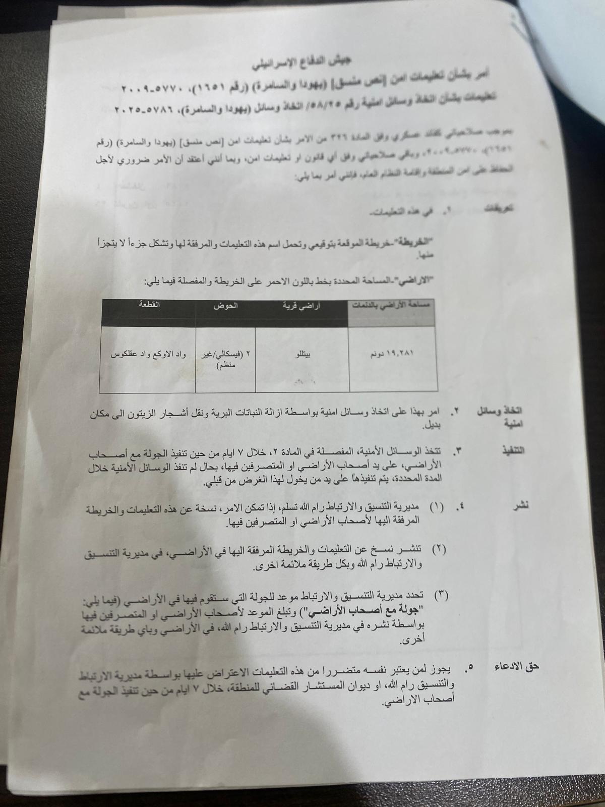 • 2025-08-07 The Israeli Military Occupation Notifies 40 Fruitful Olive Trees with Removing in Al Nabi Salih Village/ North Ramallah